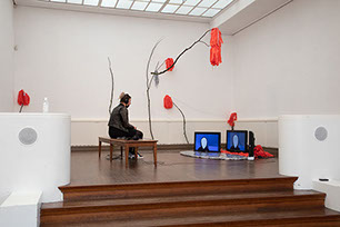 Eva Susova involves the female voice in her work. In Pictura she shows her installation 'The Veiled Lady', consisting of organic materials such as branches, wood chips and a hanging mask, in combination with a sound composition that combines vocal recordings into a non-linear onomatopoeic story.