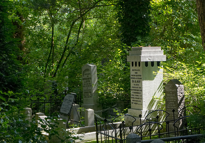 Esserveld Cemetery was established in 1924, when the Northern and Southern Cemetery reached full capacity. With its innovative concentric plan, a completely new park-like layout was introduced. The cemetery and its recognisable Amsterdam School-style entrance gate are national monuments.