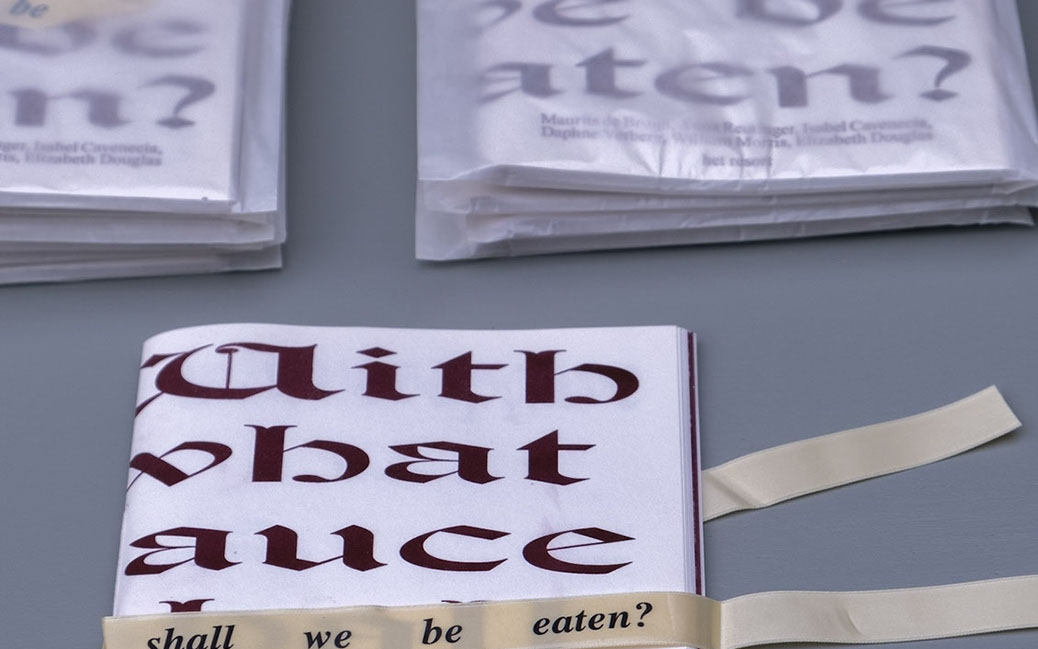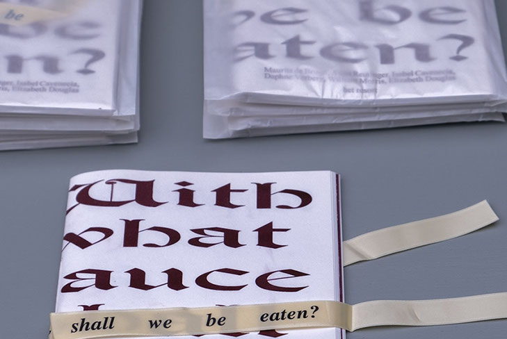 * De titel With what sauce shall we be eaten? komt uit 'An Old Fable Retold', geschreven door William Morris in 1884. In dit socialistisch verhaal debatteren kippen op een conferentie voor de kerstdagen met welke saus ze zullen worden opgediend. Wanneer een gehavend uitziende haan van middelbare leeftijd betwijfelt of ze überhaupt wel gegeten moeten worden, barst er een kakelend commentaar los. Uiteindelijk sluit de kippen-conferentie met de conclusie dat langzaam gegaard worden de minst revolutionaire manier van koken is. Morris illustreert hier een politieke tendens die we ook vandaag de dag zien. Het uitvergroten van de problemen in de eigen voortuin en zogenaamde keuzes die hierbij een rol spelen, leiden af van grotere thema’s. De keuze tussen cranberry compote en champignonsaus geeft wellicht de indruk dat je controle hebt over dat wat er komen gaat, maar leidt af van het feit dat de dood onafwendbaar is.