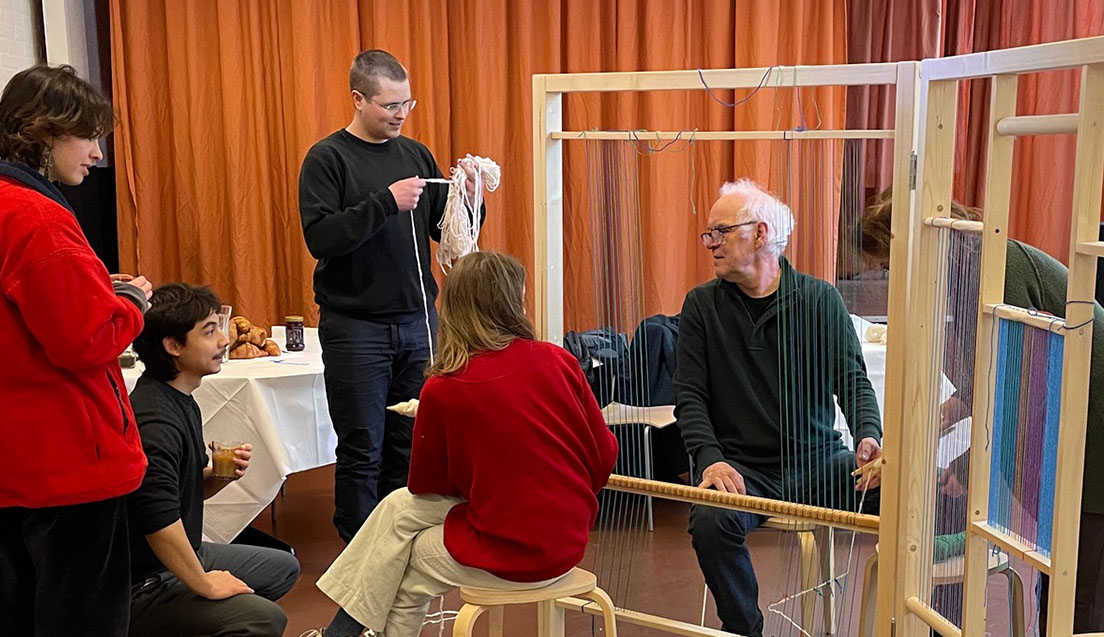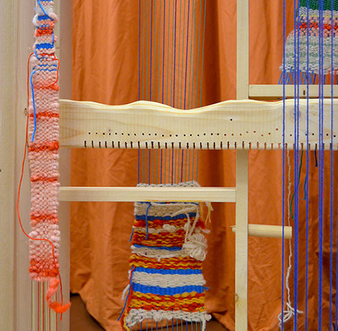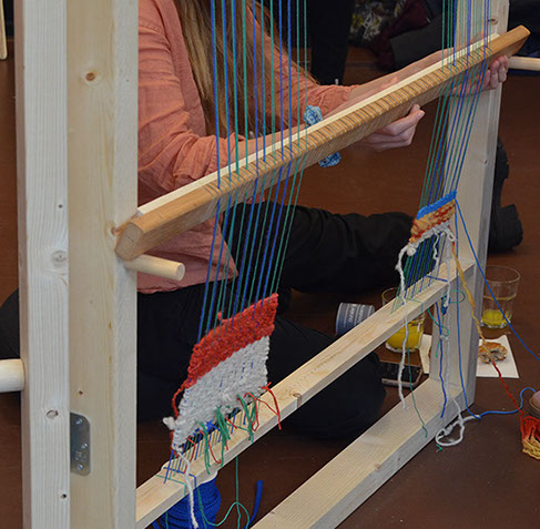 Marijke Klamer creëerde een 3-delige weefgetouw-installatie. Een houten frame met sculpturen en gespannen draden van zelfgesponnen wol en katoen, waar mensen tegelijkertijd aan kunnen werken. Om samen één werk te maken.