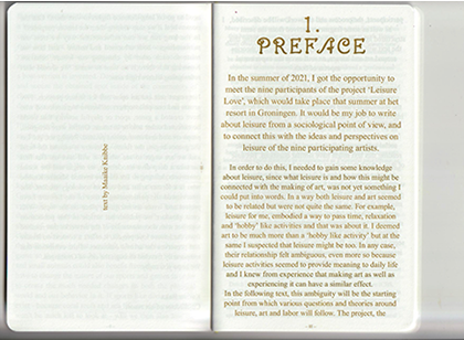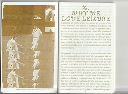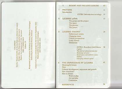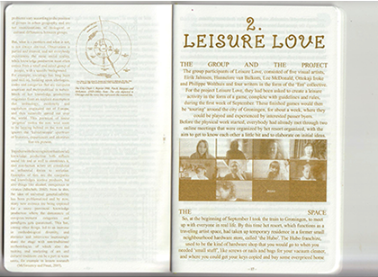 Het resort sent out an open call for leisure projects. Five artists and one philosophers collective were selected who have created a game, sport or playful activity that could be executed either solo or in teams. Outfits were designed, props created and instructions printed. Ready, set, go! Let the games begin, the future of leisure is around the bend and we are eager to see where it will take us. But first we take a deep dive into leisure, its origin and the social constructs defining it. For this we invited Maaike Knibbe who is a former resort artist (S01E01) and current sociology student. She interviewed the participating artists of the Leisure Love project and wrote an intriguing piece on the topic. It offers a context on leisure and preserves the artistic outcomes of the exhibition that temporarily traveled through the city of Groningen.