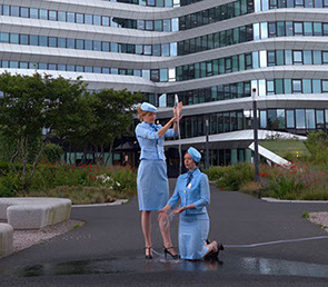 Kitty Maria: “Met het air hostess project probeerden we altijd onze taken te omzeilen als we werden gevraagd om te presenteren in kunstruimtes, we dreven af naar de gangen en de machinekamers. De ruggengraat van het project is het terugtrekken in uniform. De infiltratieweek werd een grappige confrontatie met de bedrijfswereld waar we onze uniformen op hebben gebaseerd.”