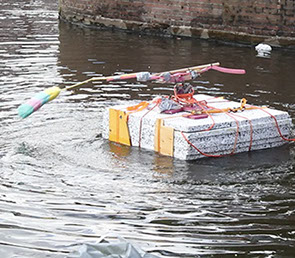 Kimball Holth: “Ik werkte met Lee aan het kanaal achter het Frank Mohr Instituut, gebruikmakend van het houten dok. Lee had het idee dat hij een beeld wilde maken dat het water kietelde en toen stelde hij voor om een paar drijvende vlotten te maken. Dit paste bij mij, omdat ik sowieso al werk maak dat wispelturig en twijfelachtig is — waardoor je het idee krijgt dat de dingen anders kunnen zijn, de installatie kan veranderen en bewegen. Misschien kan het uit elkaar vallen of nog steeds samenkomen; misschien is het werk aan het wachten totdat het voltooid is; misschien zal het nooit klaar zijn; misschien is het zelfs geen echt kunstwerk.”