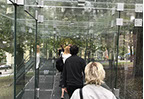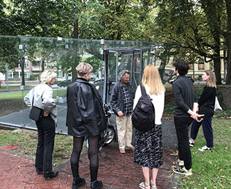 “Op 23 september ontmoetten we elkaar allemaal in een voormalige homosauna die nu nog het hoofdkwartier is van Het Resort. We stelden elkaar kort voor en liepen naar het Tschumi-paviljoen. Dat eigenaardige gebouw van glas wat we het allemaal hebben gezien, maar nog nooit eerder binnen zijn geweest. Hier is het, een sleutelhouder van het Tschumi-paviljoen wacht op ons.