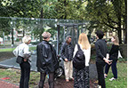 “On 23rd of September we all met at a former gay sauna now being inhabited by Het Resort. Briefly introducing each other we walked to see the Tschumi pavilion. That peculiar building made out of glass where every one of us have seen it but have never entered before. Here it is, a keyholder of Tschumi pavilion has been waiting for us. The doors are open, we can enter. Illuminating, we see every passerby, they see us walking inside, yet the feeling of isolation hits us. We feel safe, as if partially invisible. Sky becomes grey colour, rain starts pouring on a glass ceiling, we look up, feels like a waterfall. Anna Fleuri takes photos of our newly formed band. All set.
