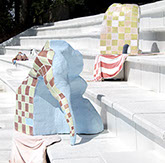 The artworks of Demans, Ehry and De Haan are so well made for the swimming pool that they immerse in their surroundings. 30 cm, Various Sizes created by De Haan leans on the diving boards as if the rulers were placed there in the 1950s; the sculptures Embodiment at rest by Demans melt in the heat like the regular visitors on the tanning tribune. While Demans and De Haan got inspired by the characteristics of the pool and its visitors, Ehry got inspired by the people who make a visit to the pool possible. She investigated the daily jobs of the pools’ employees and in A Pool Cosplay she shows their habits, connections and tasks in a new perspective. Who makes the swimming experience possible? Who keep the pool clean and safe, the grass fresh and green, and what happens behind the scenes? (...) READ MORE