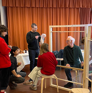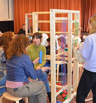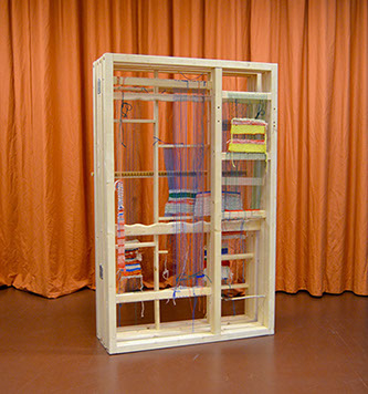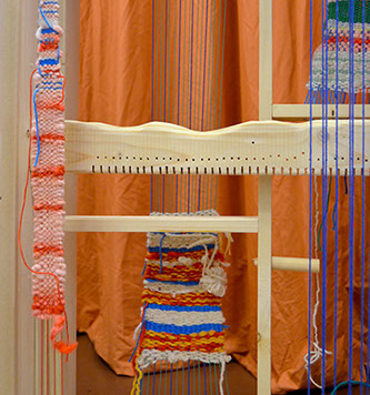 Marijke Klamer built a 3-piece loom-installation. A wooden frame with sculptures and stretched threads of self-spun wool and cotton, where people can work simultaneously. Creating one artwork together.